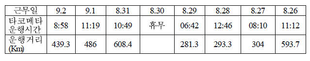 3) 타코메타 운행기록 및 운행일지 상 피재자의 운행 현황을 보면, 2009.8월 총 운행시간은 258시간, 총 운행거리는 11590Km, 총 운행일수는 타코메타상 30일, 운행일지상 23일이고, 2009. 7월 총 운행시간은 222시간, 총 운행거리는 10588Km, 총 운행일수는 타코메타상 27일, 운행일지 상 23일이며, 2009.6월 총 운행시간은 244시간, 총 운행거리는 11434Km, 총 운행일수는 타코메타상 26일, 운행일지 상 25일로 확인